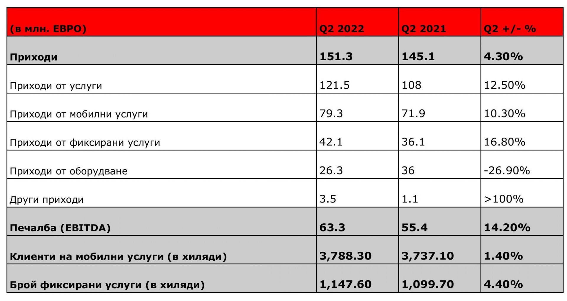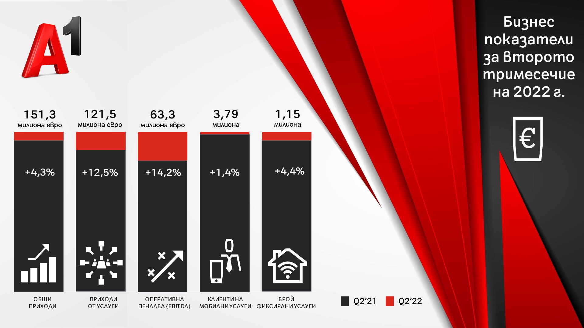 Най-големият телеком по приходи в България за 2021 година продължава своето развитие и отчита силно второ тримесечие на 2022 годината. А1 България регистрира ръст на всички основни показатели, като приходите от мобилни и фиксирани услуги се увеличават с 12,5% до 121,5 млн. евро спрямо същия период за 2021 г., а общите приходи растат с 4,3% и достигат 151,3 млн. евро. Печалбата преди данъци, такси, лихви и амортизация (EBITDA) възлиза на 63,3 млн. евро, регистрирайки ръст от 14,2% на годишна база.