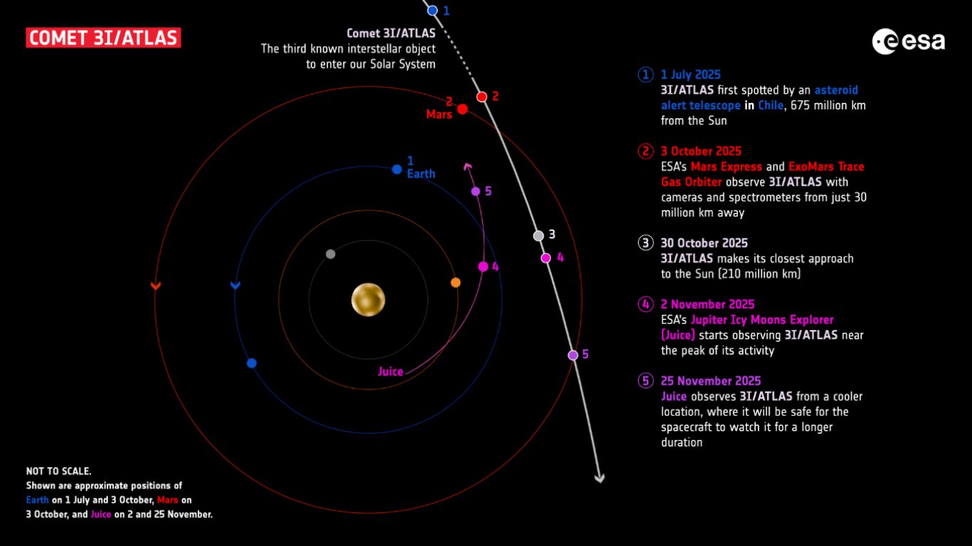 Кометата преминава през Слънчевата система под неудобен ъгъл за наблюдение от Земята, но други апарати — най-вече около Марс — успяват да я заснемат отлично. Mars Reconnaissance Orbiter я наблюдава от разстояние 30 милиона километра, а Psyche и Lucy я снимат от противоположни посоки, разкривайки нейната кома и опашка.