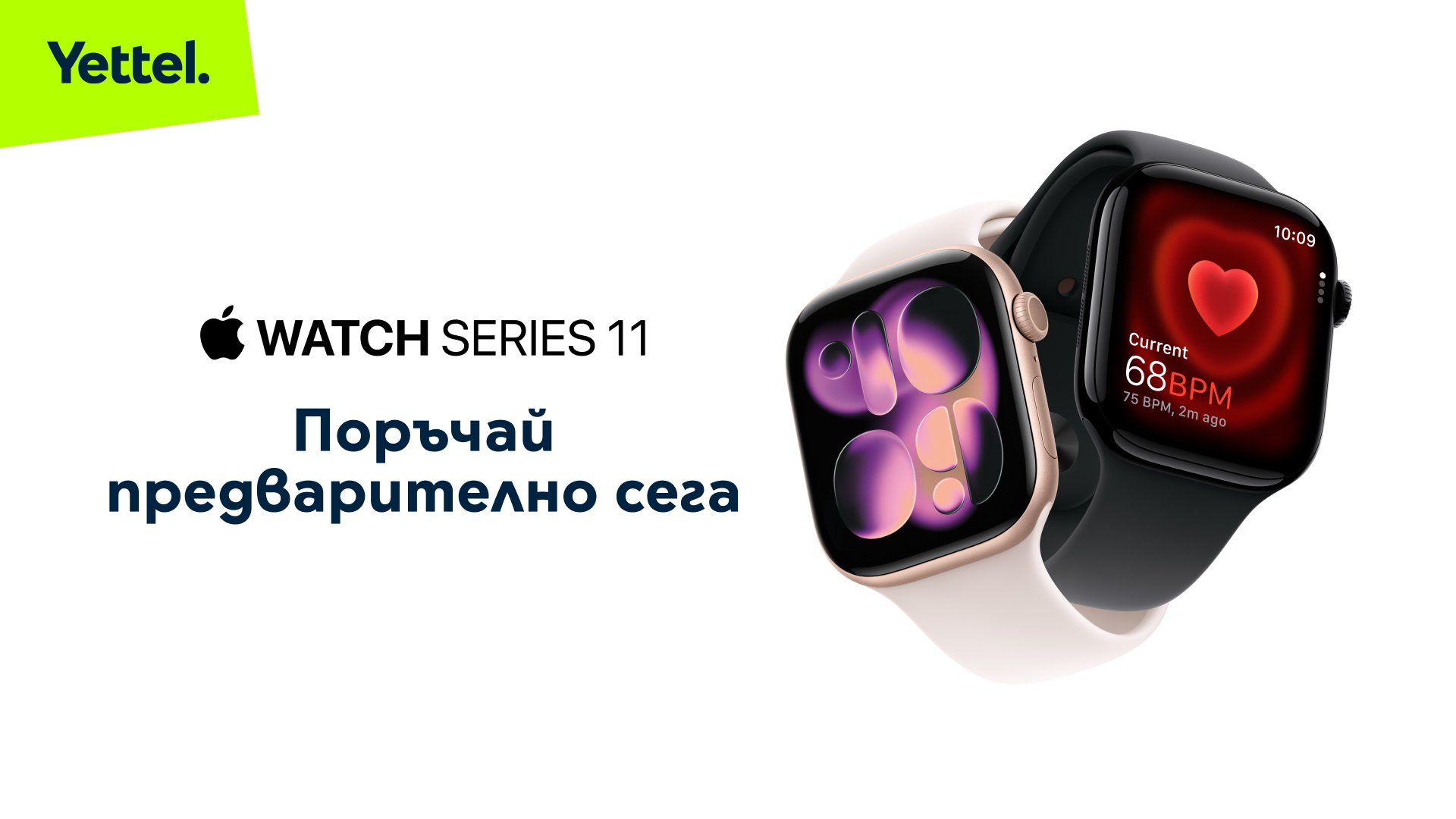 Apple Watch Series 11 идва с функция за оценка на съня (sleep score), до 24 часа живот на батерията и дисплей, който е два пъти по-устойчив на надраскване. Моделът се предлага с алуминиев корпус в новия цвят Space Gray, както и в Jet Black, Rose Gold и Silver, а също и с полиран титаниев корпус в цветове Natural, Gold и Slate. Цената му в Yettel започва от 869,99 лв./ 444,82 евро в брой или 38,99 лв./ 19.94 евро на месец за 2 години.