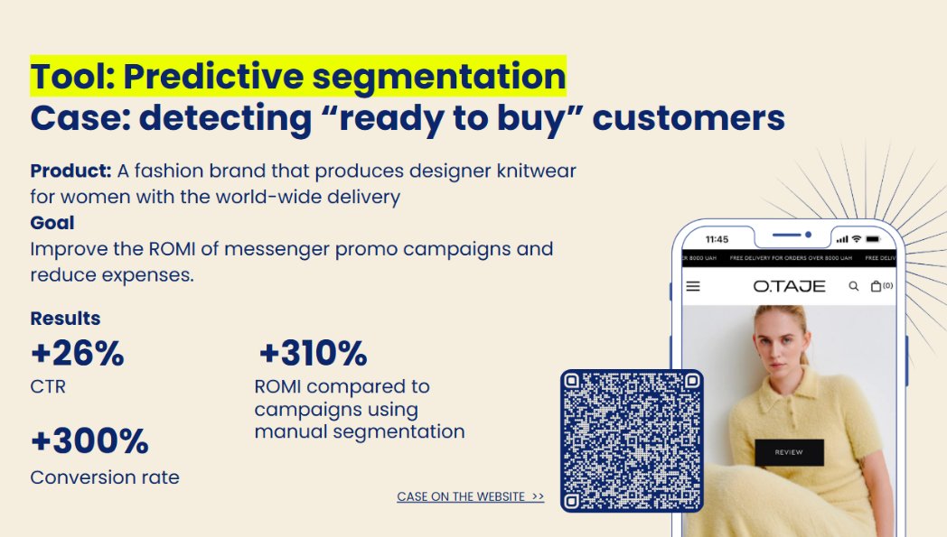 Марката за облекло O.TAJE използва прогнозна сегментация за подобряване на изпращанията и постига + 310% ROMI във Viber и + 300% конверсия в сравнение с ръчно изграден сегмент.