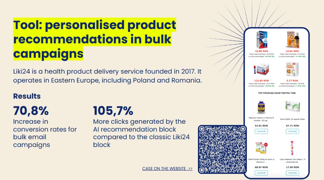 Например фармацевтичният маркетплейс Liki24 повишава резултатите от масовия имейл чрез добавяне на блокове с персонализирани препоръки към масовите кампании — постигайки +70,8% конверсия.