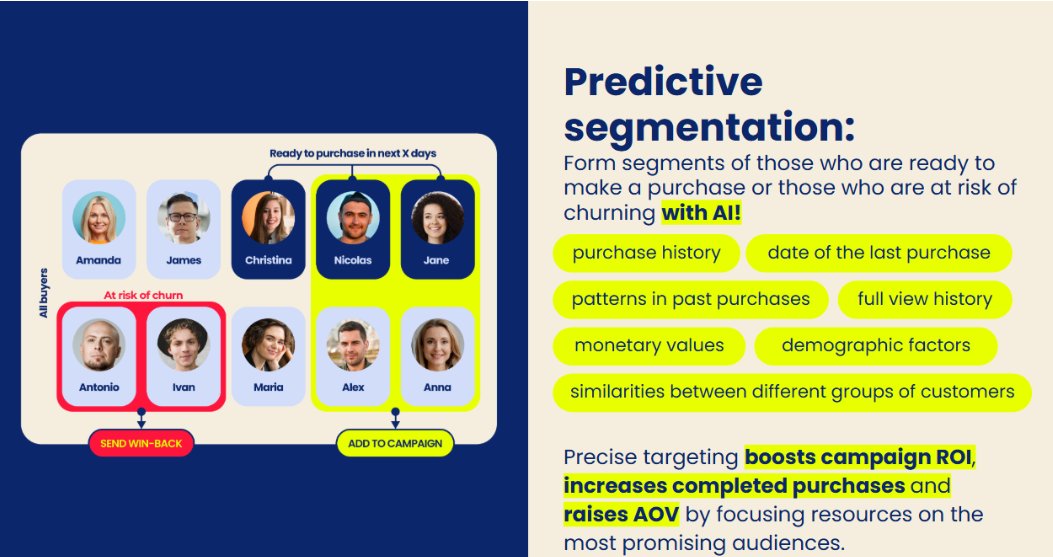 Как иначе брандовете задълбочават персонализацията с ИИ? Освен подобряването на съдържанието, те създават по-прецизни аудитории, използвайки прогнозна сегментация. Когато насочваме хора, които наистина са готови да купуват, производителността на кампанията се покачва драматично — особено в скъпи канали.